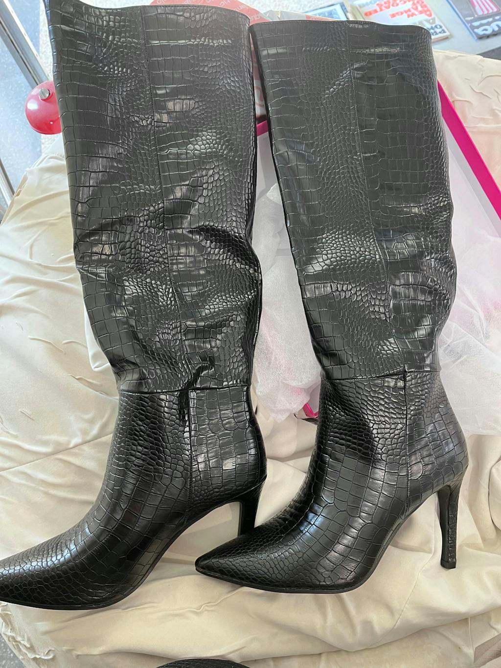 Il materiale effetto pitonato e la silhouette slanciata avvolgono la gamba, garantendo comfort e stile. La punta affusolata e il colore nero ne fanno un capo versatile e femminile, ideale per aggiungere un tocco di audacia a qualsiasi outfit.