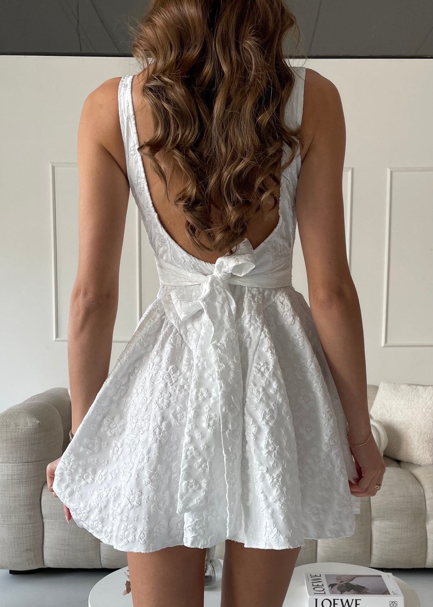 VERONICA - vestito mini bianco con gonna ampia con scollo posteriore e fiocco