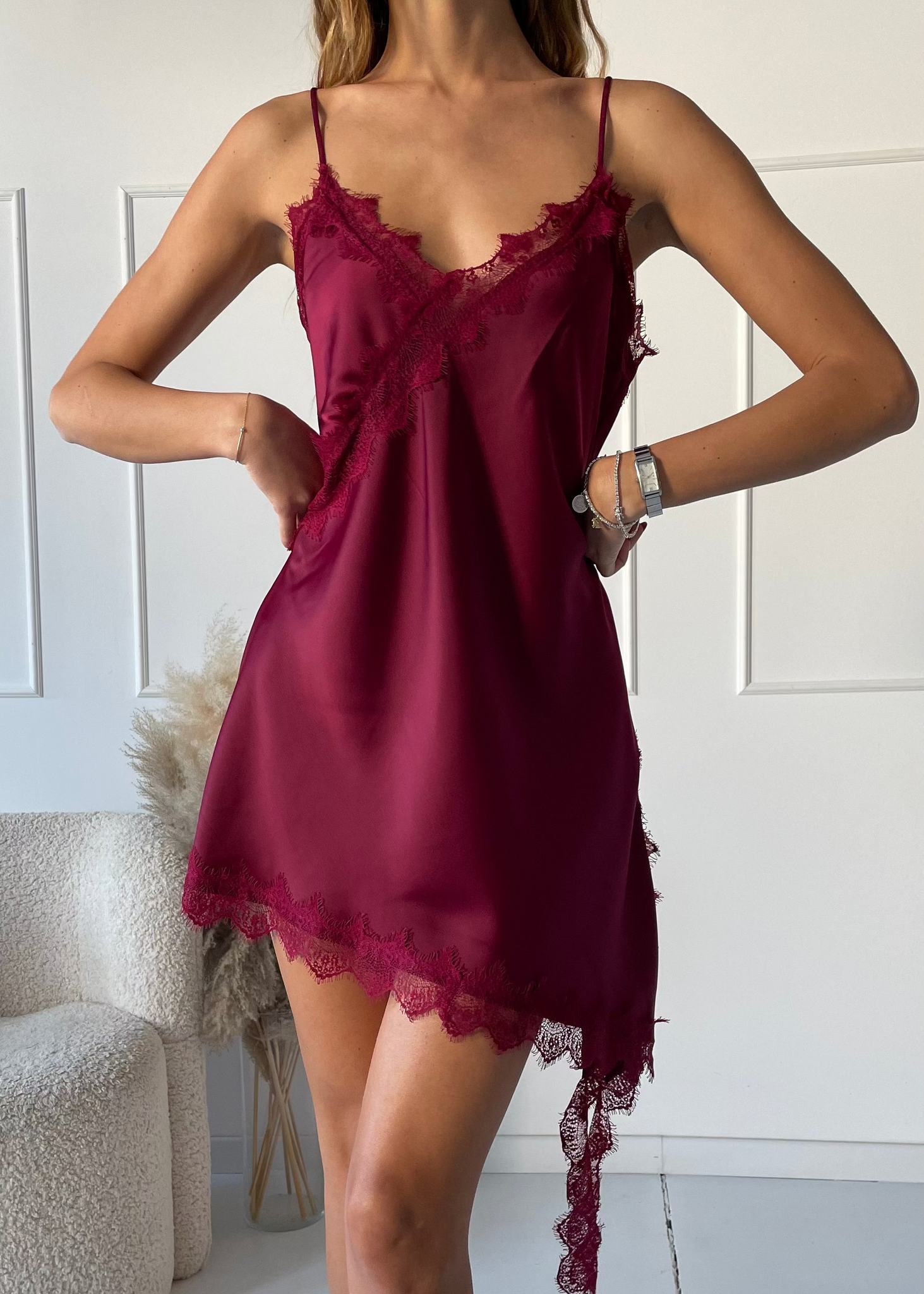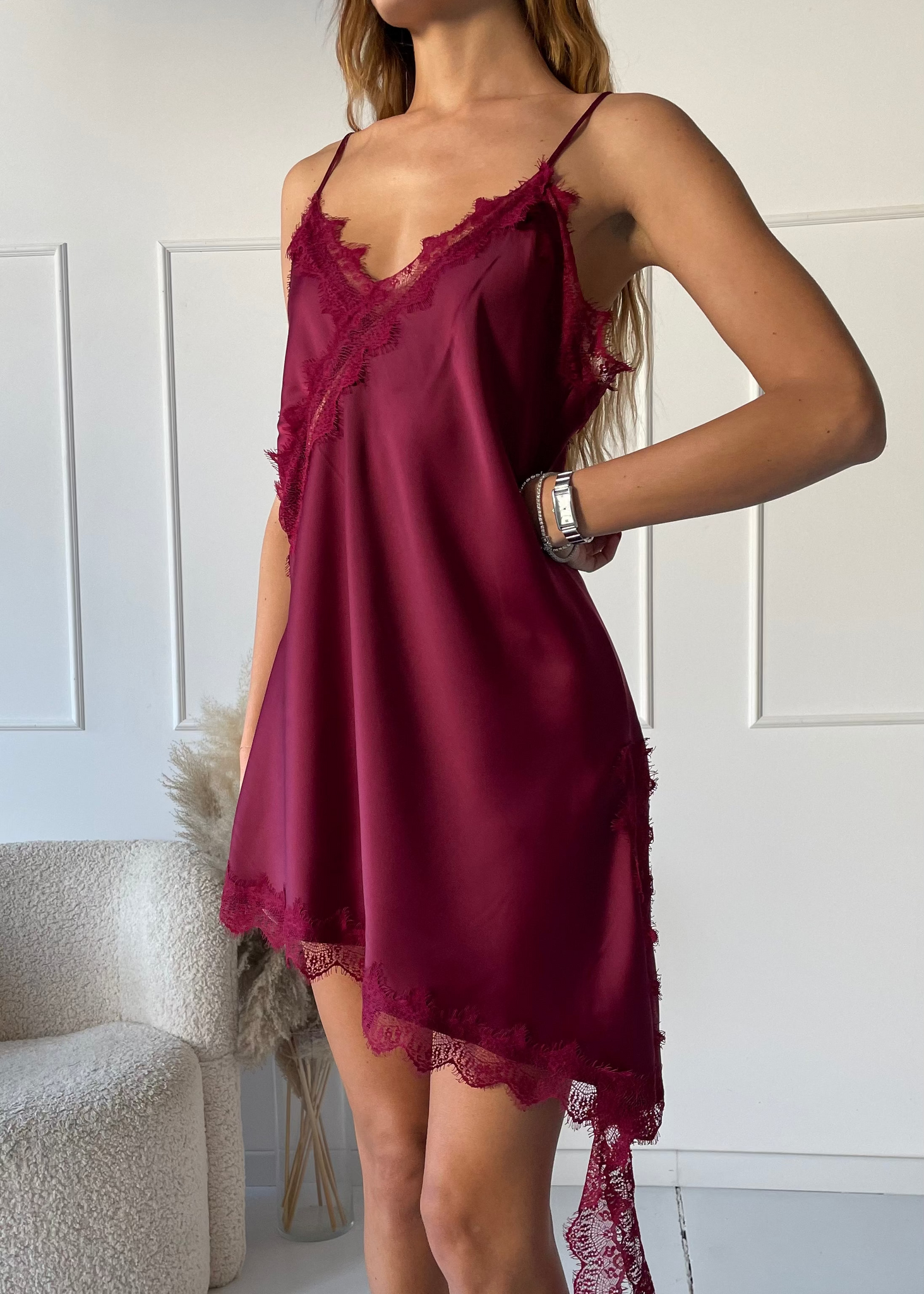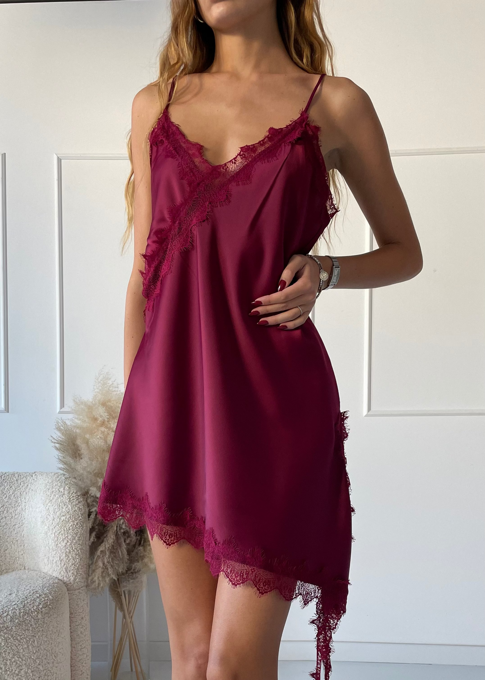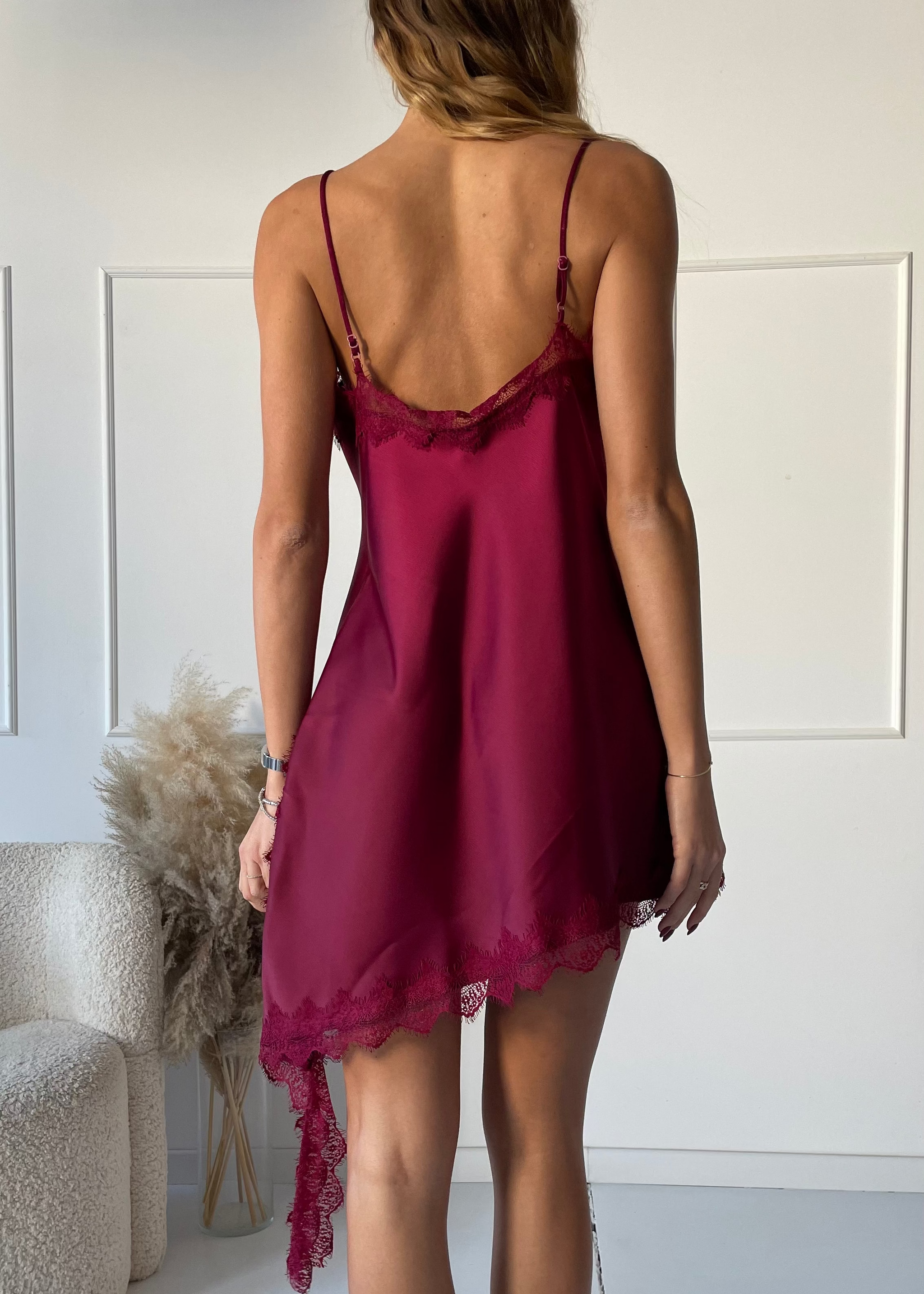 ANISSA - canottiera wine effetto seta asimmetrica con bordi in pizzo