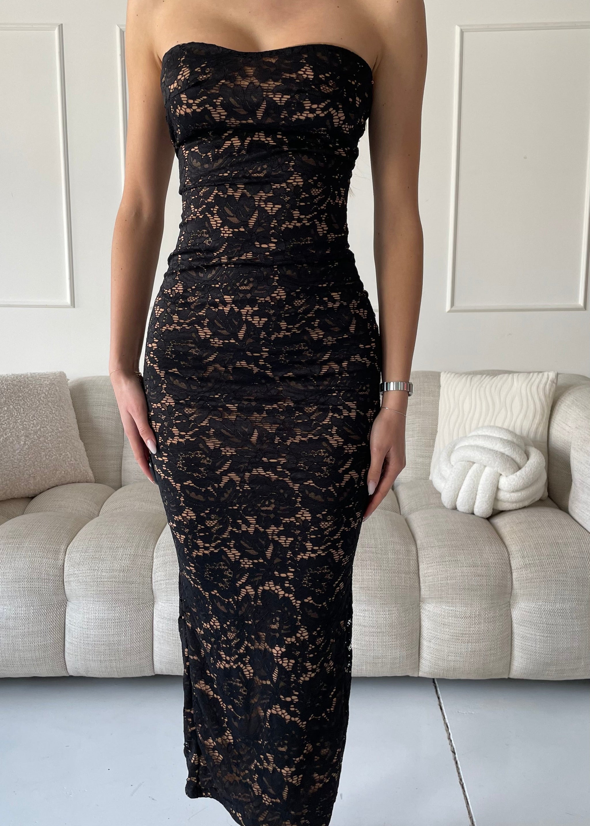 L'iconico tubino nero si evolve in una versione ultra-glam e sofisticata. Questo abito midi senza spalline è la quintessenza dell'eleganza moderna: il fit aderente e senza spalline modella il corpo mentre il pizzo floreale aggiunge quella texture ricercata che eleva subito il look.