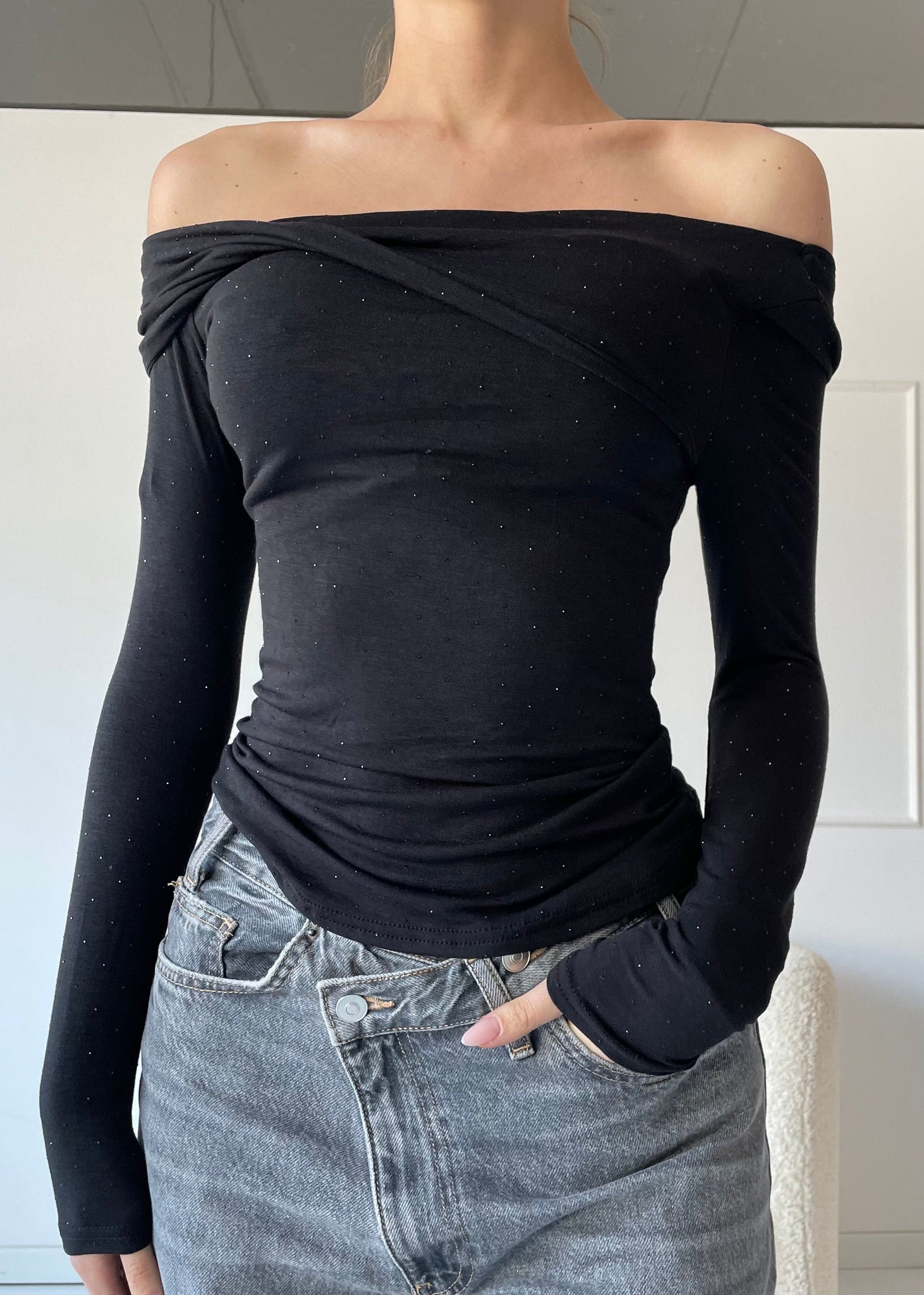 PEYTON - maglietta con spalle scoperte e drappeggio con strass in nero
