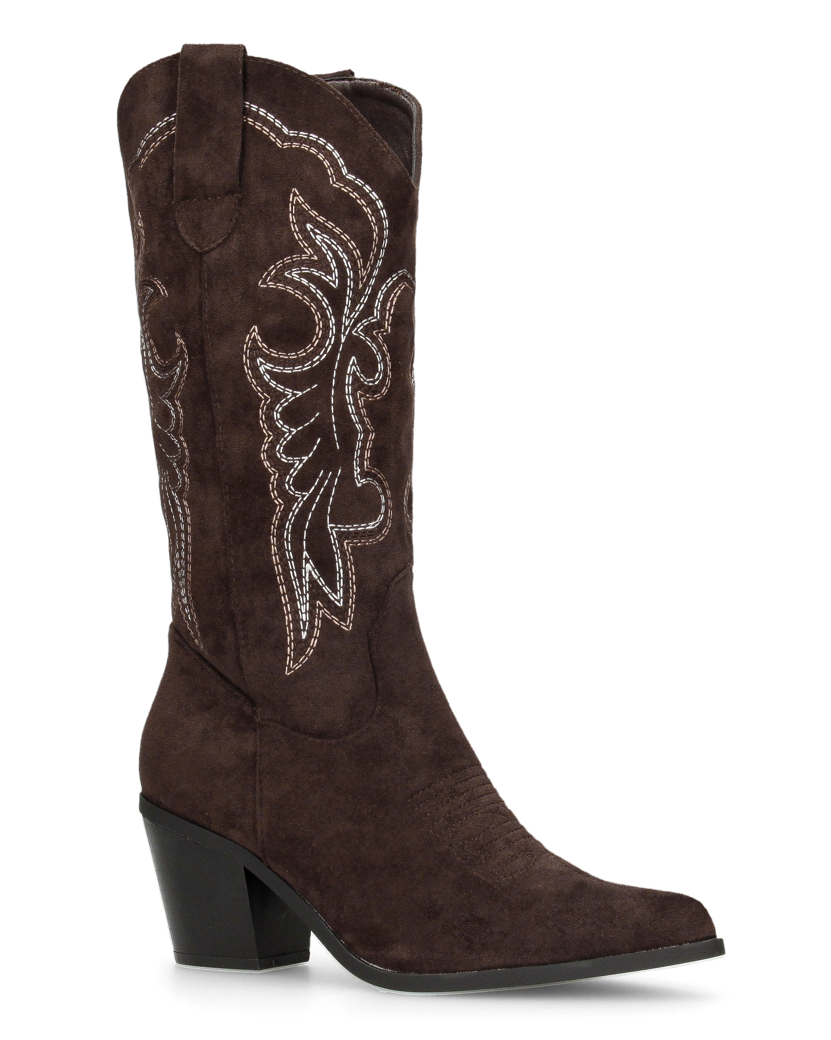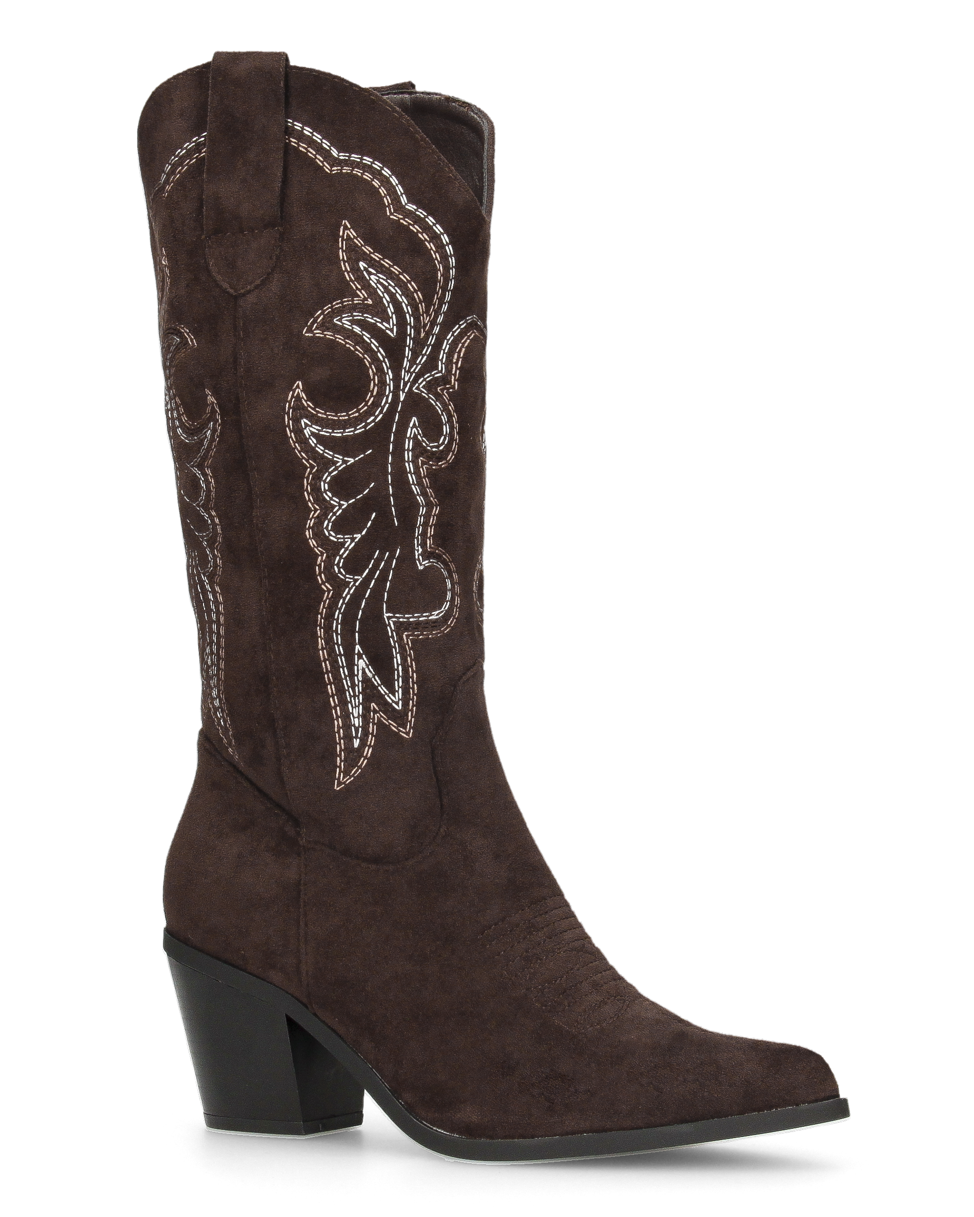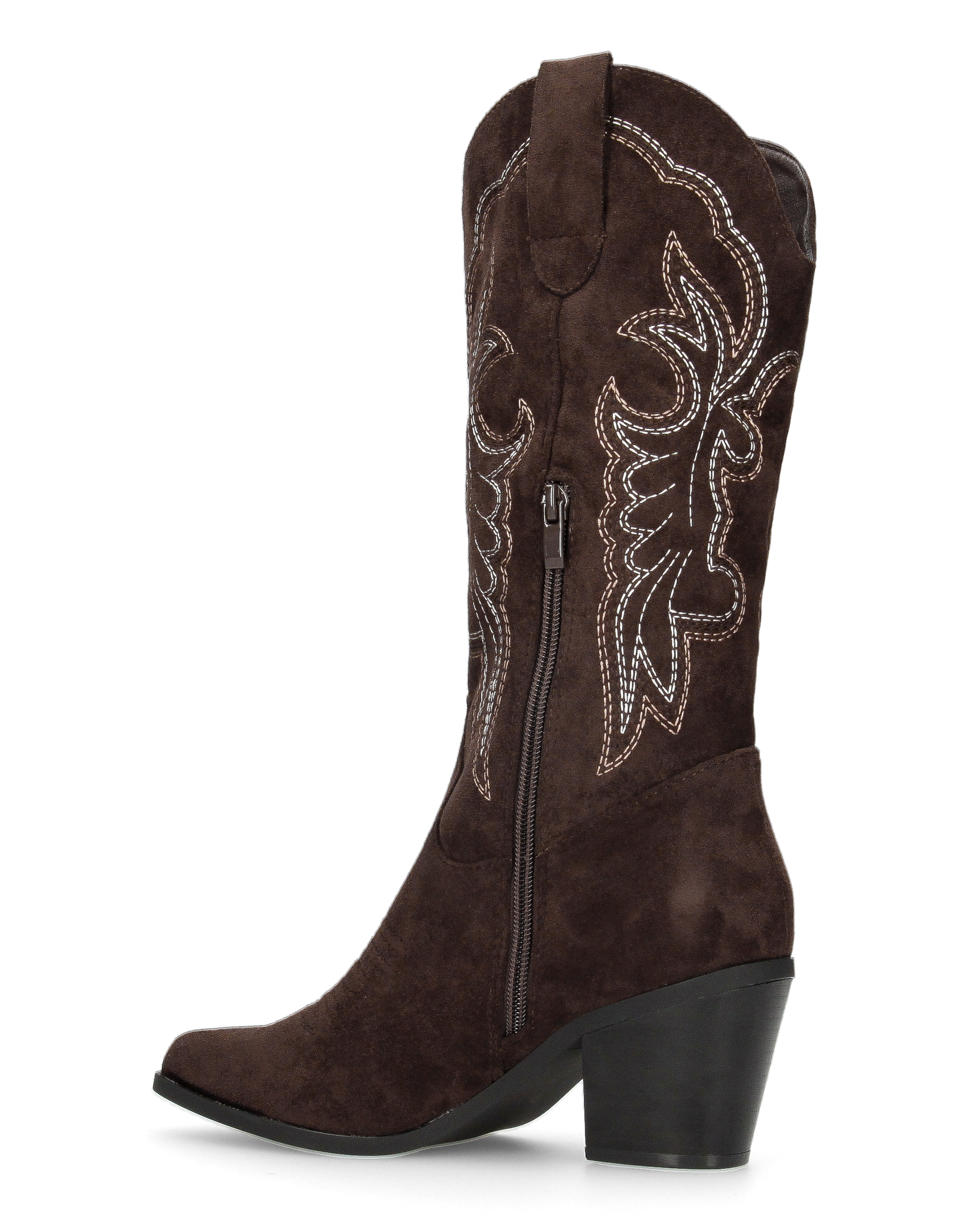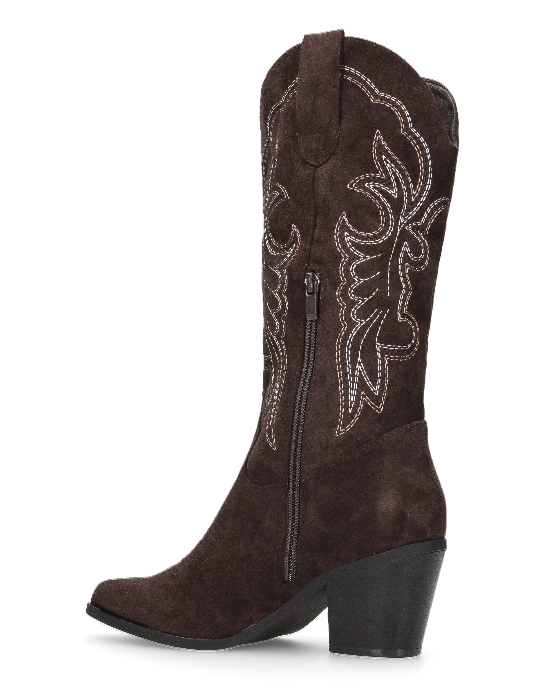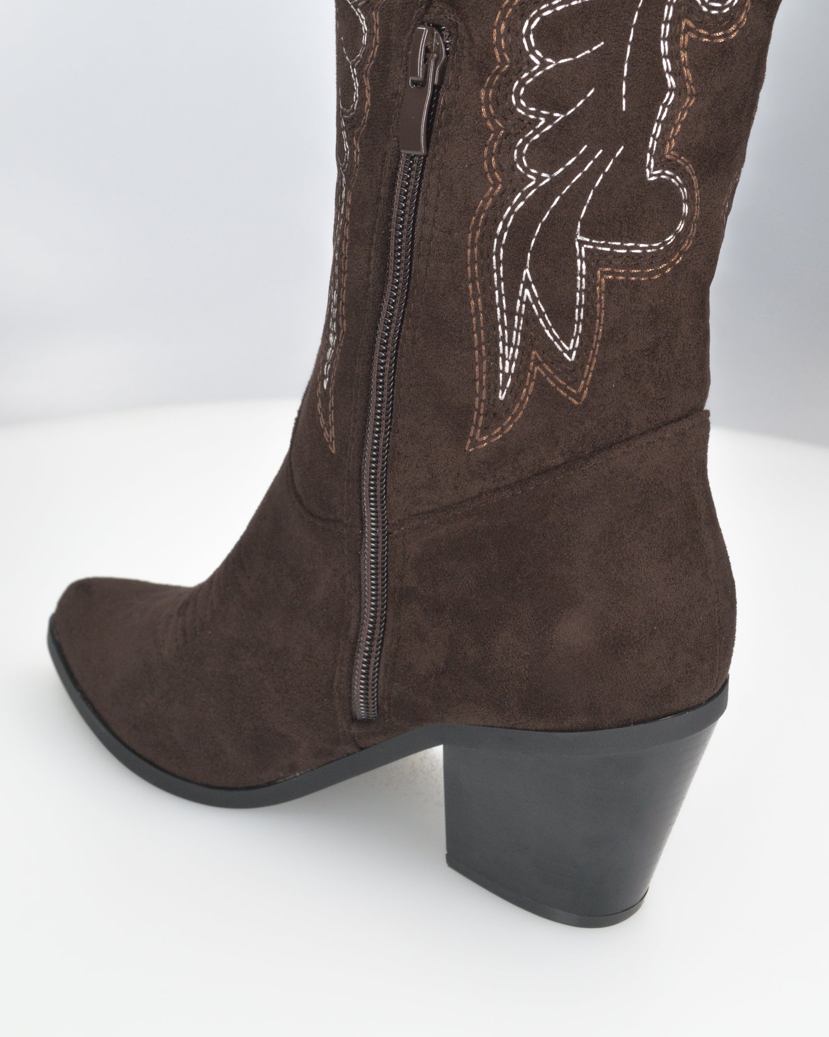 • Design: Presenta una punta affusolata e un tacco a blocco svasato, che garantisce stabilità e slancia la figura. Il gambale è la parte più distintiva, con intricate cuciture decorative a contrasto di colore bianco che formano motivi a riccioli e foglie. Una cerniera laterale a tutta lunghezza permette una calzata comoda e veloce.