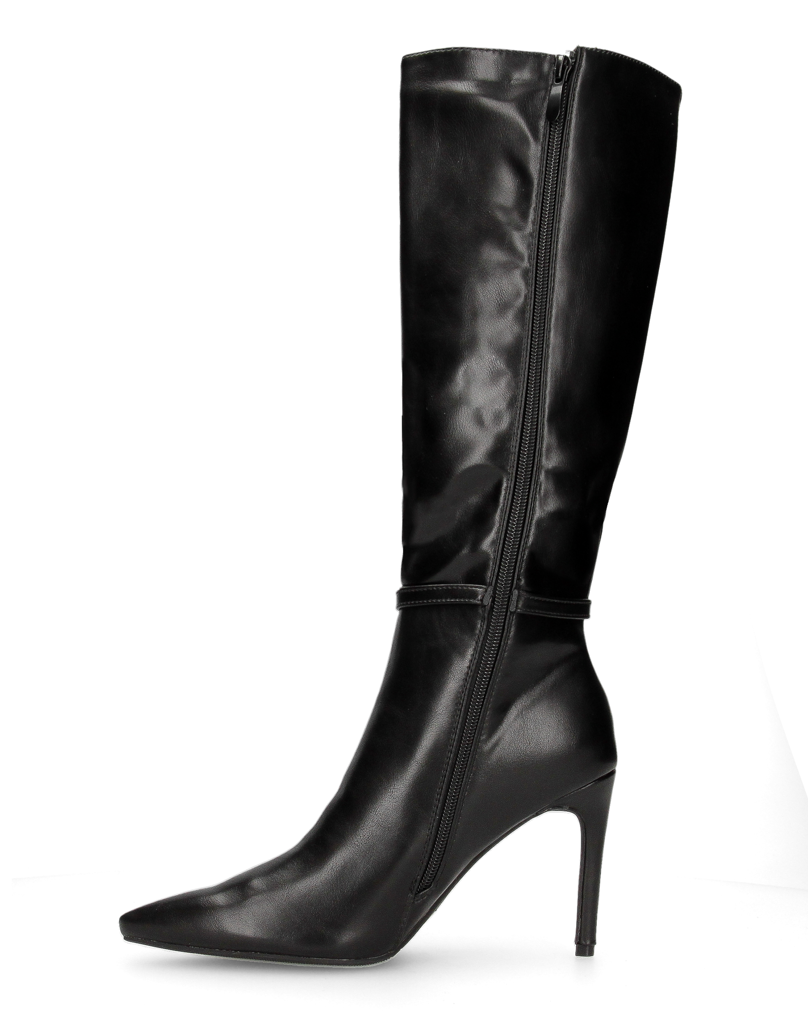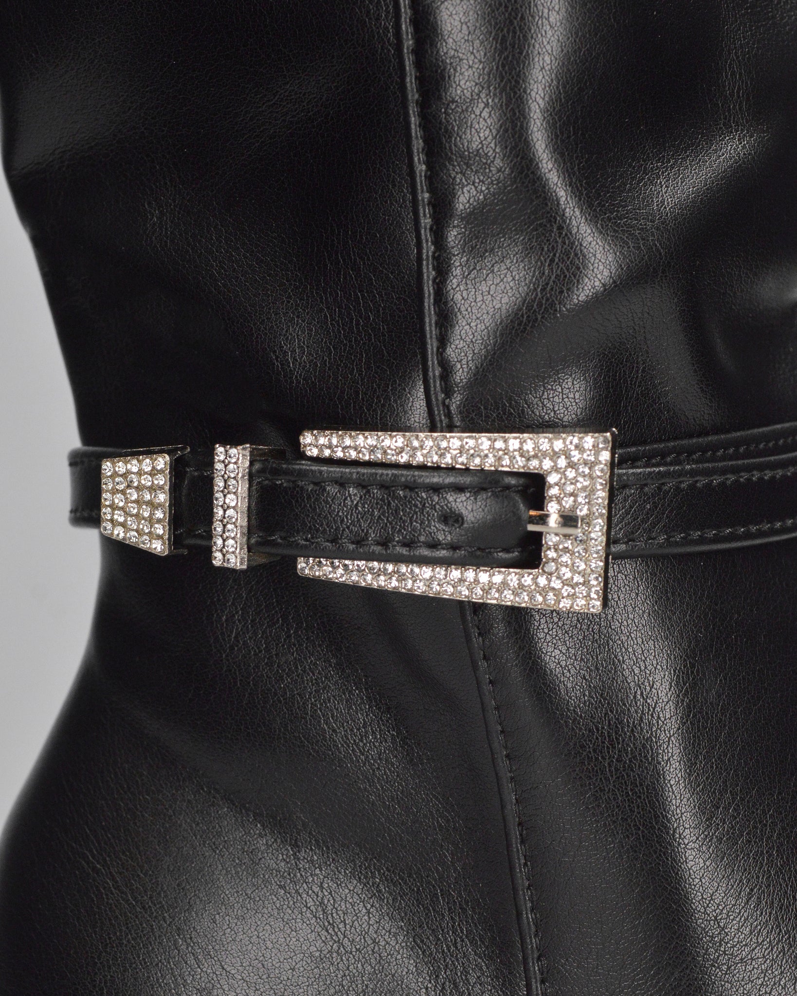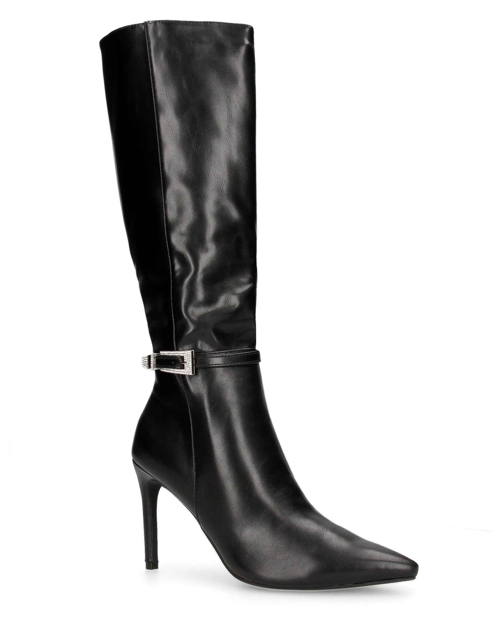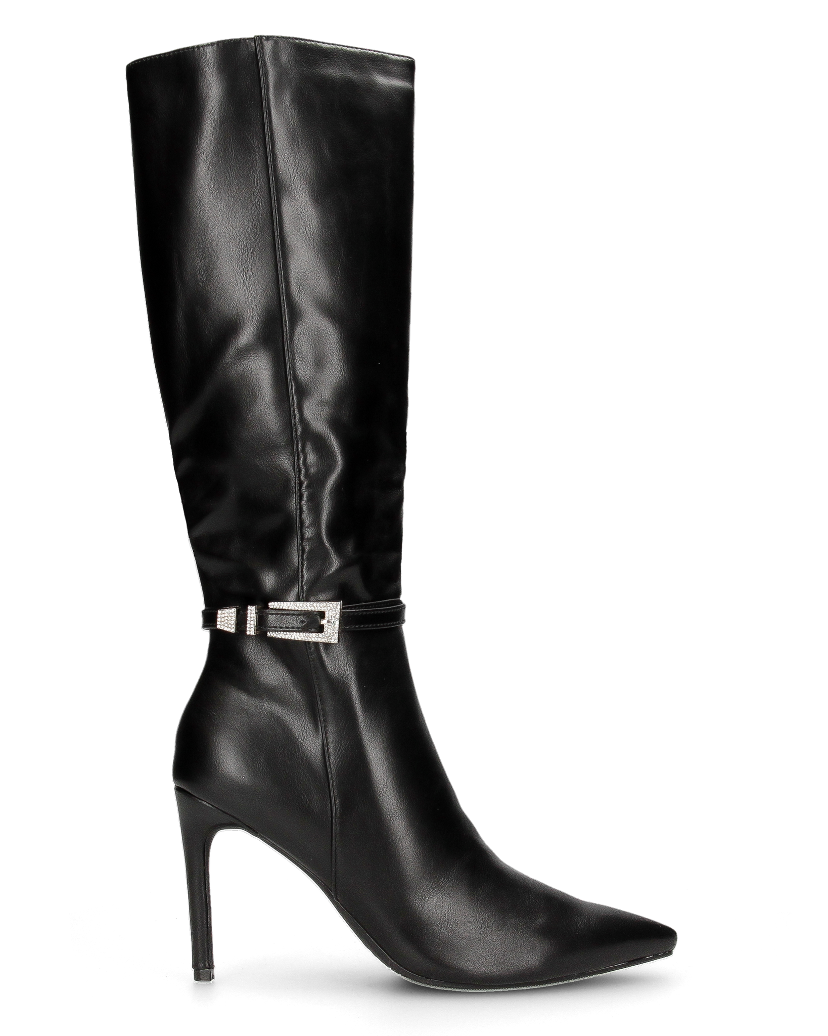 MAKI - Stivale alto sotto al ginocchio in ecopelle nero con tacco stiletto e fibbia gioiello
